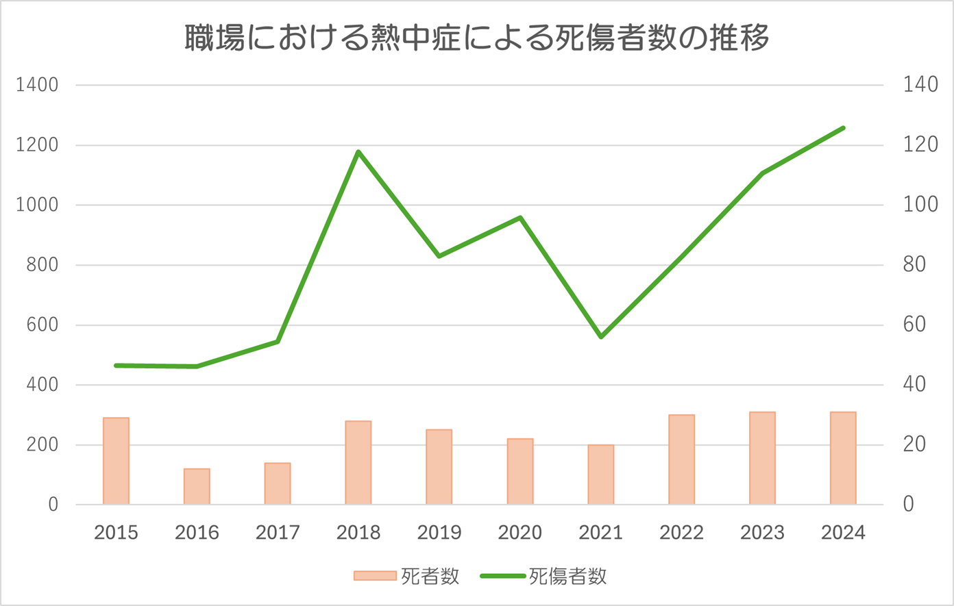 近年、猛暑の影響で職場での熱中症による死傷災害が相次いでいます。その数は2014年から2023年の10年間で約3倍に増え、経営者にとっては人命だけでなく企業の信用問題にも直結する大きなリスクとなりました。