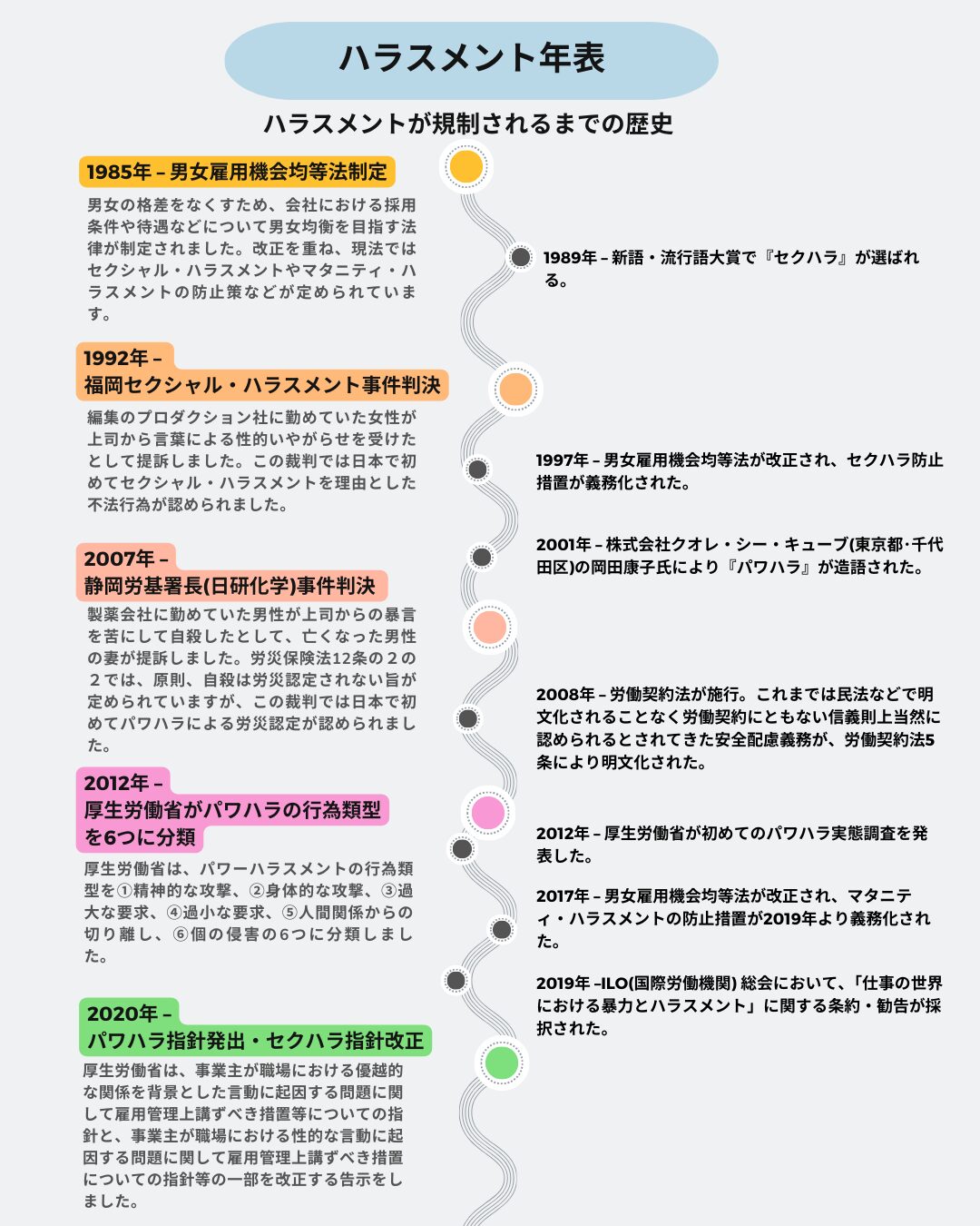 なお、最初のハラスメントは、セクシャル・ハラスメントに不法行為責任を認めた福岡セクシャル・ハラスメント事件(福岡地判平成4年4月16日判タ783号60頁)と言われています。その後、雇用機会均等法の平成9年改正でセクハラ防止義務が導入され、同様の類型は、平成28年改正で妊娠・出産に対するマタニティ・ハラスメントや育児・介護に拡大されました。